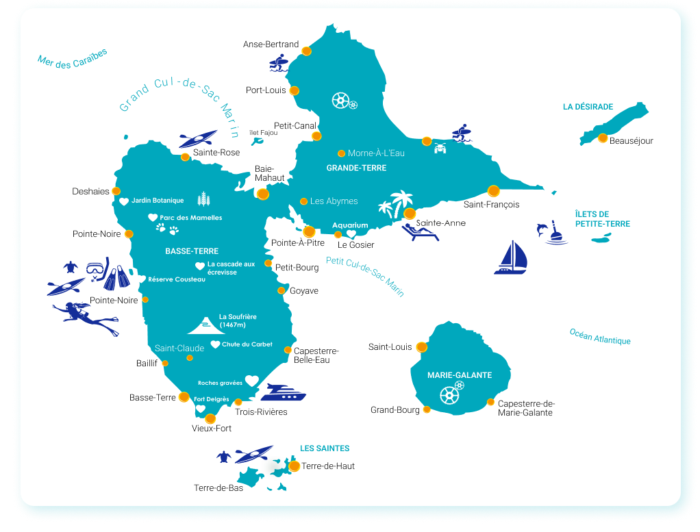 La Guadeloupe : un archipel composé de 6 îles principales, Basse-Terre, Grande-Terre, La Désirade, Marie-Galante, Terre-de-Haut et Terre-de-Bas (Les Saintes), et d’une multitude d’ilets et d’ilots.